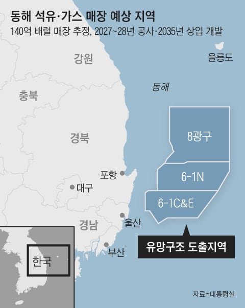 안덕근 산업부 장관은 매장 가치가 삼성전자 시가총액의 5배 수준이라며, 2027년이나 2028년에 공사를 시작해 2035년 상업 개발이 가능할 것이라고 전망했습니다. 세계적 에너지 개발 기업들도 이번 개발에 높은 관심을 보이고 있습니다.